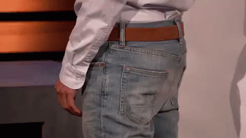 A man in jeans and a white shirt demonstrates a 'before and after' effect, likely related to a butt lift or implant.