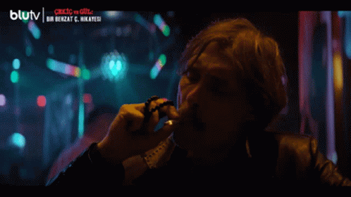 a man is smoking a cigarette in front of a blue screen that says blutv in red