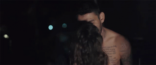 A shirtless man with chest and neck tattoos passionately kisses a woman in a dimly lit setting.