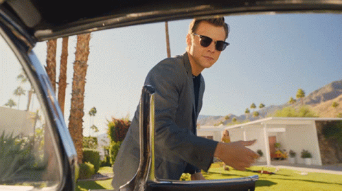 Harry Styles, also known as Jack Chambers, acts as a gentleman, opening a car door in a stylish suit and sunglasses.