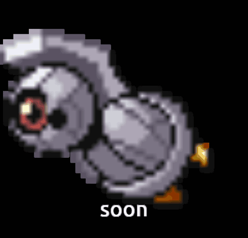 A pixel art animation of a shiny Beldum, with the word 'soon' displayed below it.