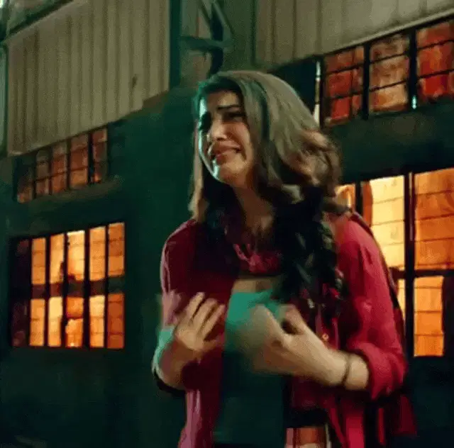 Belen Esteban reacting on a TV show set, wearing a stylish purple and white patterned dress.