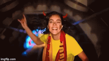 An energetic Belgium fan with devil horns and face paint cheers for her team, making a rock-on gesture.