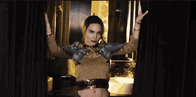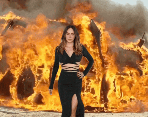 Belindapop striking a confident pose in a stylish black dress with a dramatic fire background.