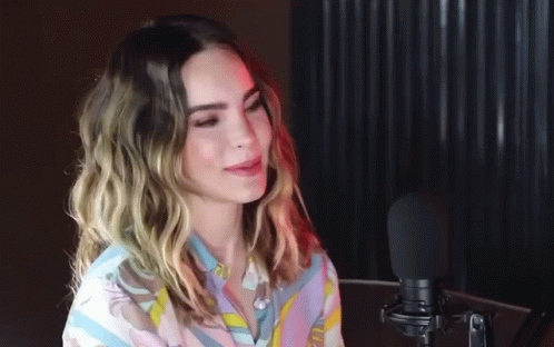 Belinda blows a kiss to the camera, wearing a patterned shirt and dark nail polish.