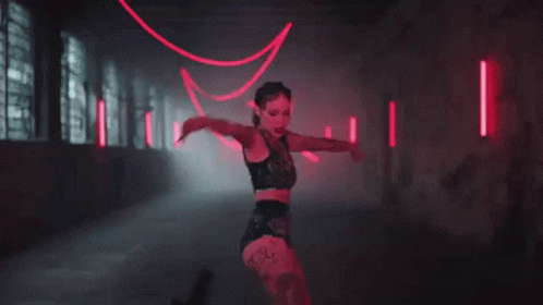 Belinda Peregrin performs a dynamic dance, moving from dancing to hanging upside down in a neon-lit room.