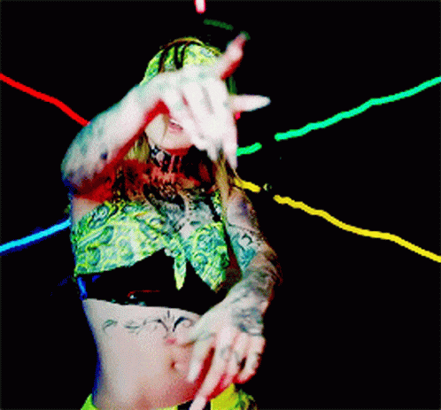Belinda Belindapop dancing energetically in a bandana and crop top against a neon-lit background.