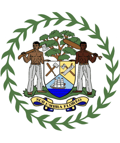 Belize's national symbols: its Coat of Arms with two men, a tree, and 'Sub Umbra Floreo', followed by the national flag.