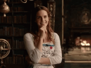 Emma Watson as Belle from Beauty and the Beast, smiling sweetly in a library setting.