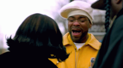 Method Man, wearing a yellow jacket and beret, talks to another person in a scene from the Belly Movie.