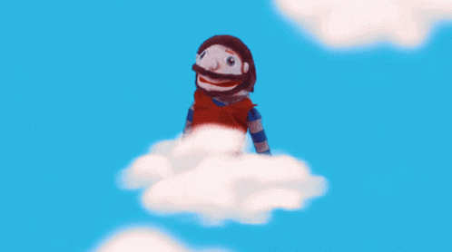 Beltrano, the puppet character, sits on a fluffy cloud in a vibrant blue sky.