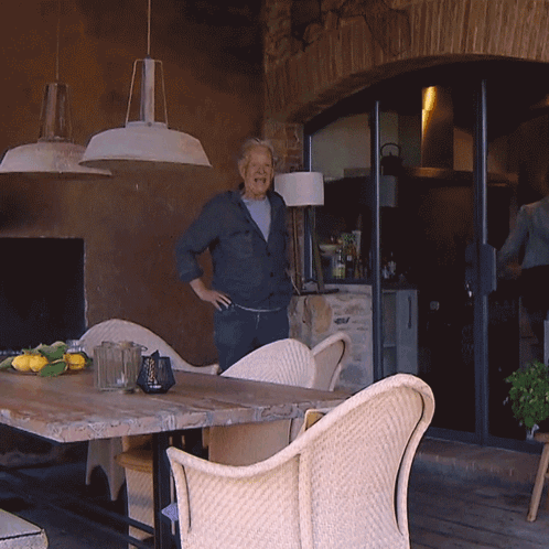 Albert from B&B Vol Liefde enthusiastically cheers with arms raised in an outdoor setting.