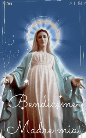 An animated depiction of the Virgin Mary, appearing pregnant, with the Spanish caption 'Bendiceme Madre mia'.