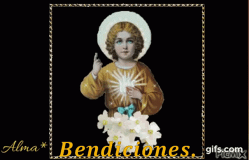 Image of Divino Niño Jesús with a halo, giving blessings, surrounded by white flowers.