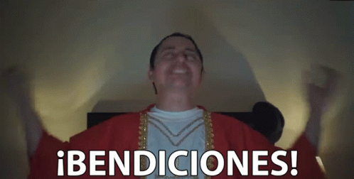 A man in a red robe raises his arms, with the Spanish word '¡BENDICIONES!' (Blessings!) displayed, from Enchufe Tv.