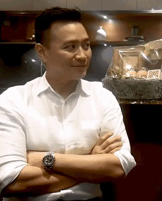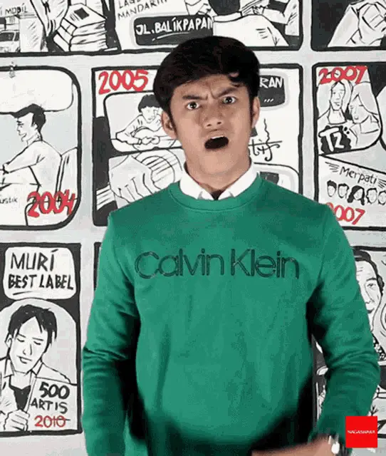 Ari Lasso, a judge on Indonesian Idol, reacts with a surprised expression, with a tablet displaying the show's logo.