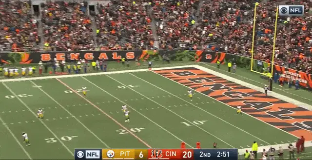 A Cincinnati Bengals player in an orange and black uniform celebrates a touchdown on the field, dropping the ball and striking a pose.