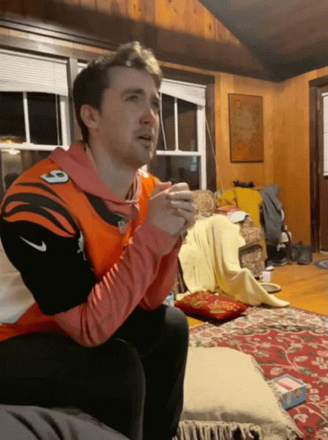 Keitel, wearing an orange and black Cincinnati Bengals jersey, watches something intently with clasped hands.