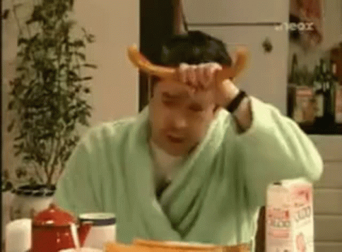 Benito Lopera Cuernos, wearing a green robe, sits at a table with a sausage on his head.