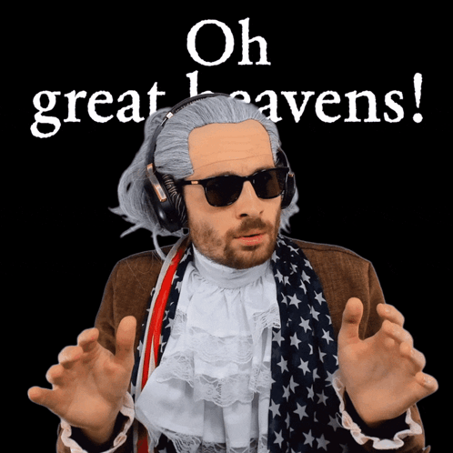 Benjammins, in colonial attire and headphones, exclaims 'Oh great heavens!' with a startled and dramatic reaction.