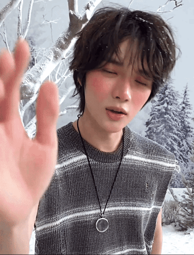 Beomgyu from TXT, with a gentle blush, reaches out his hand in a caressing gesture towards the camera.