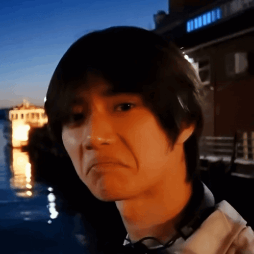 Beomgyu looks at the camera with a disapproving expression, outdoors at night with headphones around his neck.