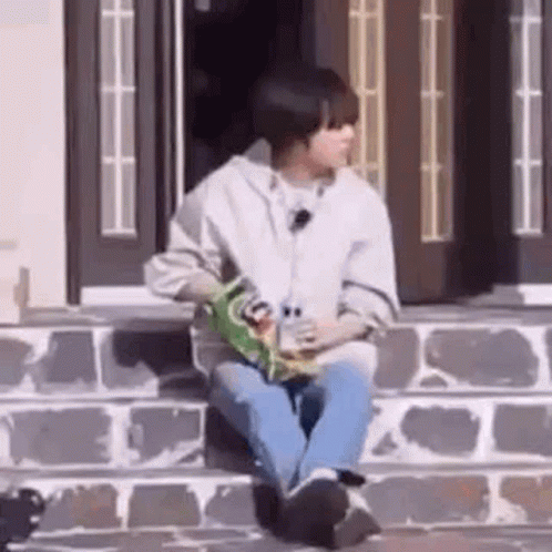 Beomgyu from TXT sits on steps, eating chips, and gives a finger heart gesture.
