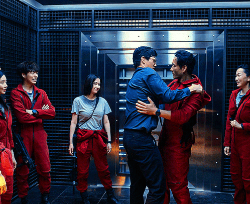 a group of people in red jumpsuits are hugging in front of a vault door