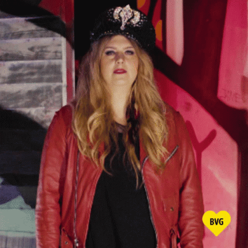 A woman in a red leather jacket and embellished cap makes a hand gesture, representing Berlin's vibrant nightlife scene, with the BVG logo.