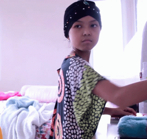 Keira Charma turns around, looking surprised in her black turban and colorful shirt.