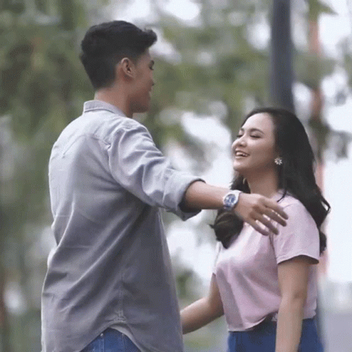 Nuca and Mahalini Raharja share a warm embrace outdoors, smiling happily.