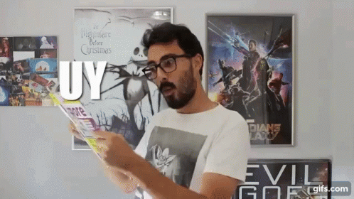 Bertus reacts with surprise while reading a magazine, as the word 'UY' appears on screen.