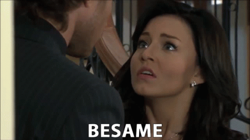 Angelique Boyer and Sebastian Rulli share a passionate kiss, with 'Besame' on screen.