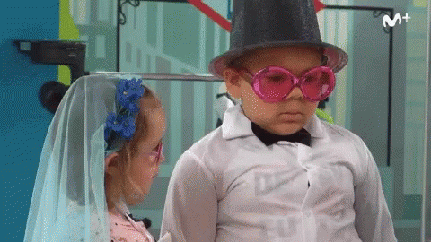 A young boy in a groom's outfit and pink heart glasses kisses a girl in a bride's veil and blue flowers.