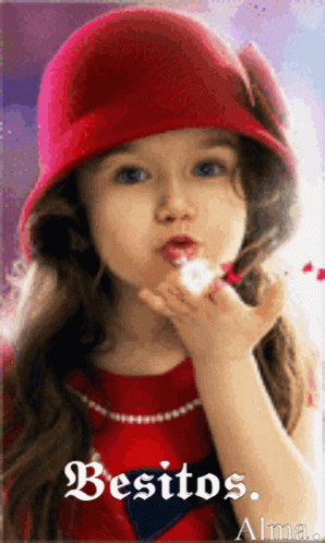 A cute little girl, identified as Alma, with a red hat blows a kiss, with the text "Besitos. Alma."