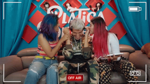 One of Los Polinesios playfully avoids kisses from two others, with 'OFF AIR' visible on screen.