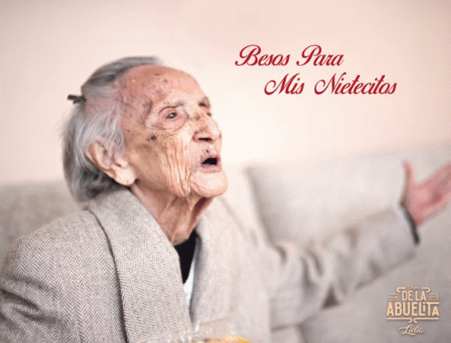 Abuelita Lidia sends warm kisses to her grandchildren, with a loving message displayed on screen.