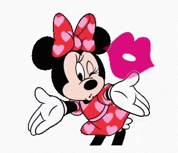 Miinie Mouse, in her heart-patterned dress, covers her mouth shyly before blowing a sweet kiss.