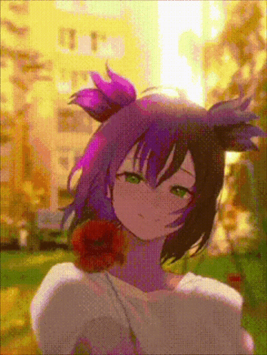 Lena from Everlasting Summer, with purple hair and green eyes, holding a red rose in a sunny outdoor setting.