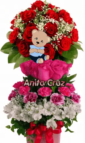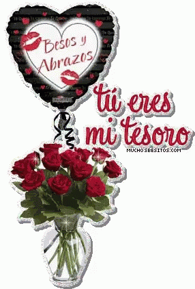 Un hermoso ramo de rosas rojas en un jarrón junto a un globo en forma de corazón con 'Besos y Abrazos'.