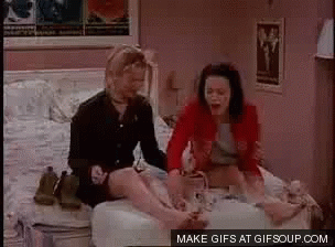 Two friends on a bed react dramatically, possibly during a hot waxing session.