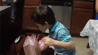 A young boy joyfully opens a pink gift bag to find a banana, his face lighting up with happiness.