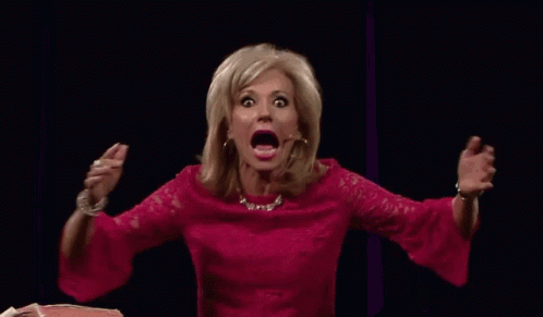 Beth Moore's wide-eyed, open-mouthed reaction, appearing shocked and surprised with hands raised.
