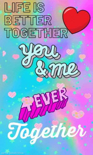 A vibrant, colorful poster with text 'Life Is Better Together you & me 4EVER Together' and hearts, celebrating love.