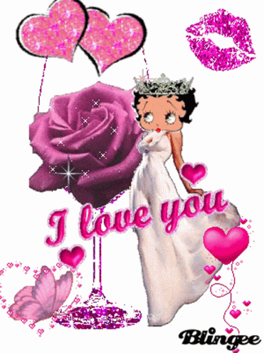 Betty Boop in a white dress, surrounded by sparkling hearts, a rose, and a butterfly, with 'I love you' text.