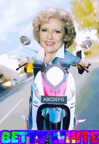 Betty White, known for The Golden Girls, joyfully rides a pink and white scooter with a license plate displaying 'ABCDEFG'.