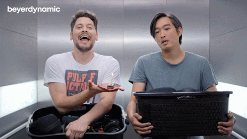 Bimon and Budimon from Beyerdynamic wish you a Happy Birthday, with one holding a small cake.