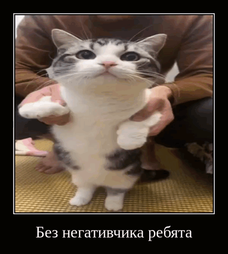 Cute cat held upright, spreading positive vibes with the message 'No negativity, guys'.