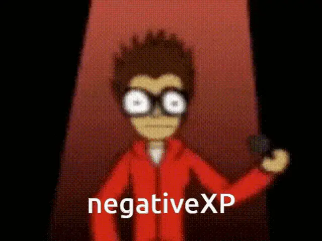 Animated character with red eyes and the message 'No negativity here' on screen.
