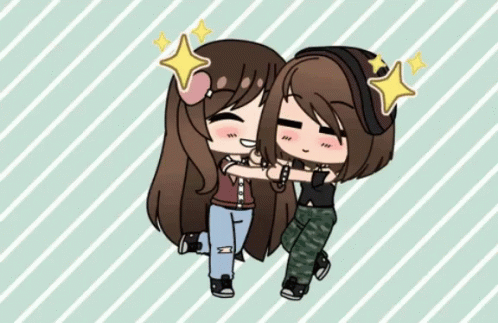 Two Gacha Life best friends forever (BFFs) share a happy hug, with sparkling stars around them.